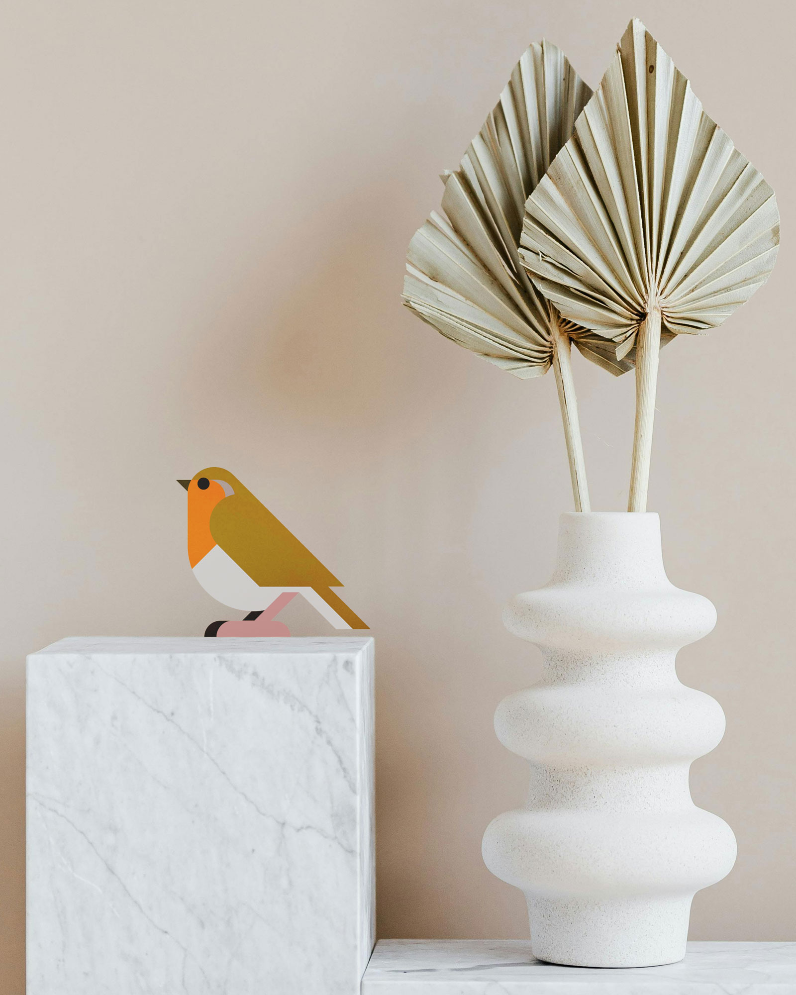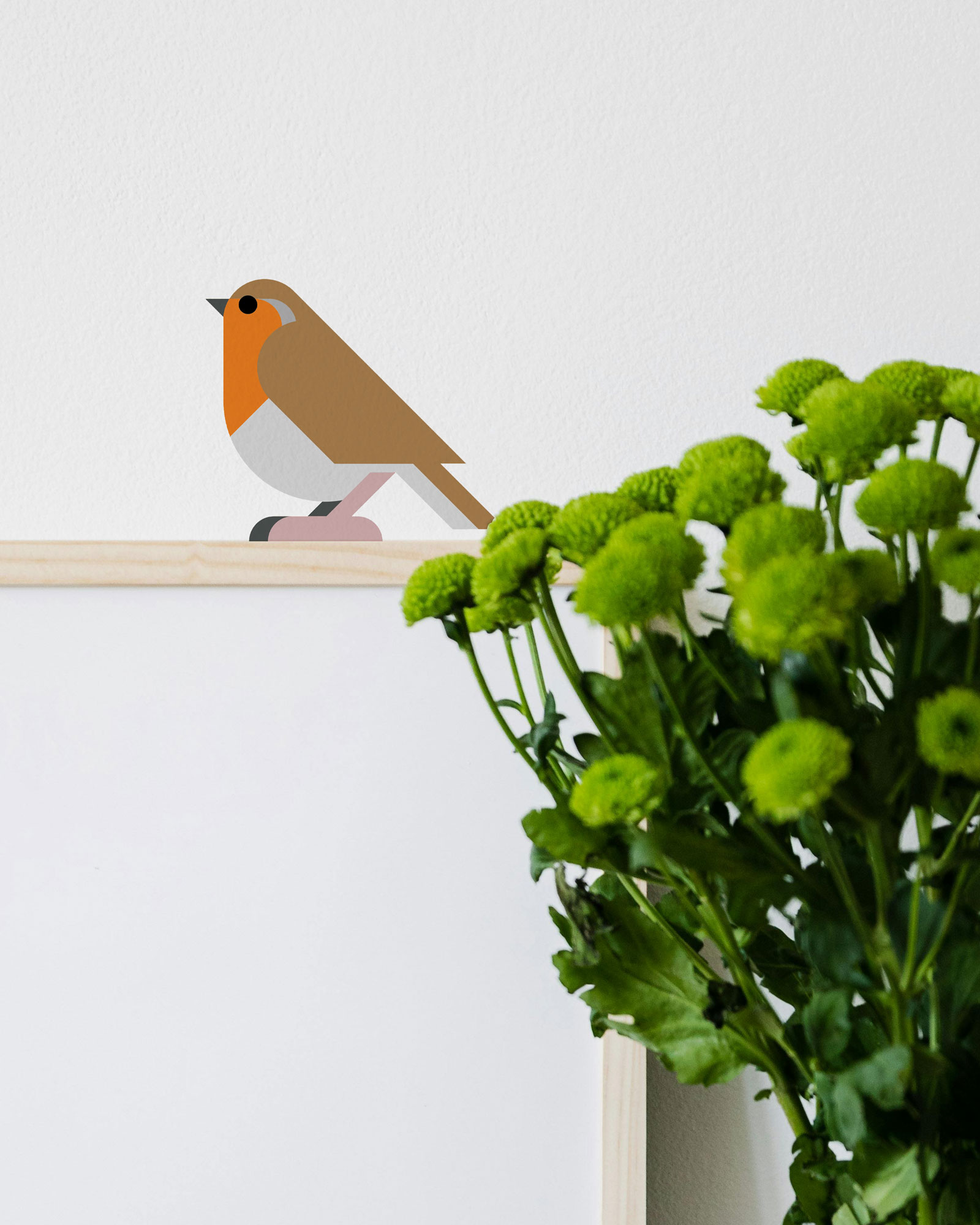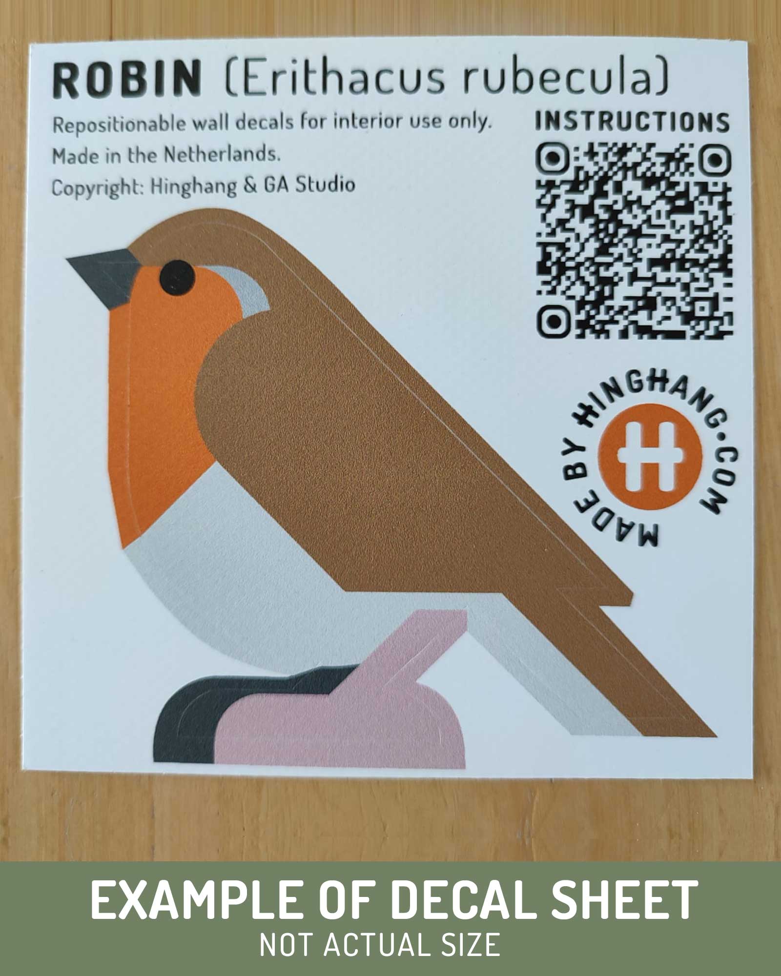 A beautiful wall decal featuring a Robin. This sticker set includes one (1) Robin and is suitable for indoor use on almost any flat surface, including wallpaper, painted or unpainted walls, wood, smooth stone, glass, and more.